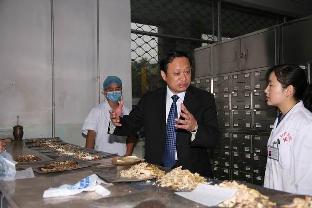 王國強副部長兼局長在咸輝副省長(左一)陪同下,視察省中醫院了解院內制劑情況(攝影 喬建安)
