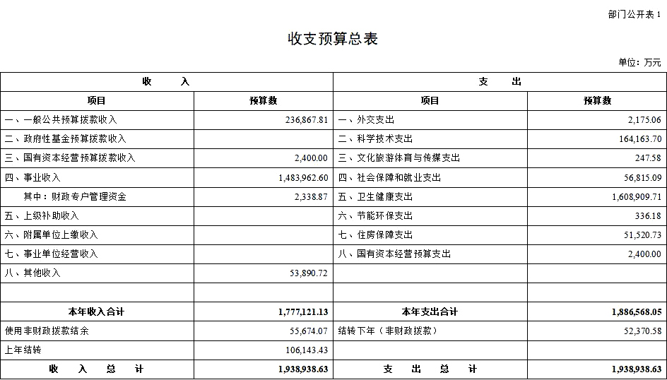 2025年收支總預算1,938,938.63萬元。收入包括:一般公共預算撥款收入236,867.81萬元、國有資本經營預算撥款收入2,400萬元、事業收入1,483,962.6萬元、其他收入53,890.72萬元、使用非財政撥款結余55,674.07萬元、上年結轉106,143.43萬元;支出包括:外交支出2,175.06萬元、科學技術支出164,163.7萬元、文化旅游體育與傳媒支出247.58萬元、社會保障和就業支出56,815.09萬元、衛生健康支出1,608,909.71萬元、節能環保支出336.18萬元,住房保障支出51,520.73萬元、國有資本經營預算支出2,400萬元、結轉下年52,370.58萬元。