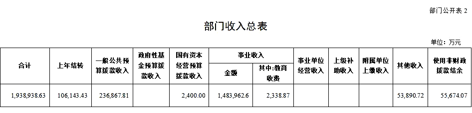 2025年收入預算1,938,938.63萬元,其中:一般公共預算撥款收入236,867.81萬元,占12.22%;國有資本經營預算撥款收入2,400萬元,占0.12%;事業收入1,483,962.6萬元,占76.53%;其他收入53,890.72萬元,占2.78%;使用非財政撥款結余55,674.07萬元,占2.87%;上年結轉106,143.43萬元,占5.48%。