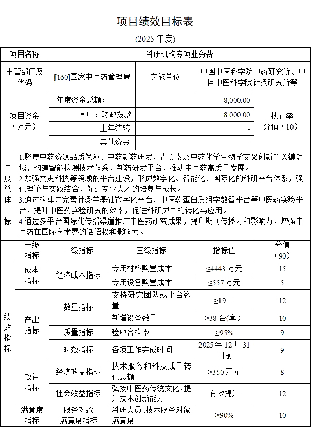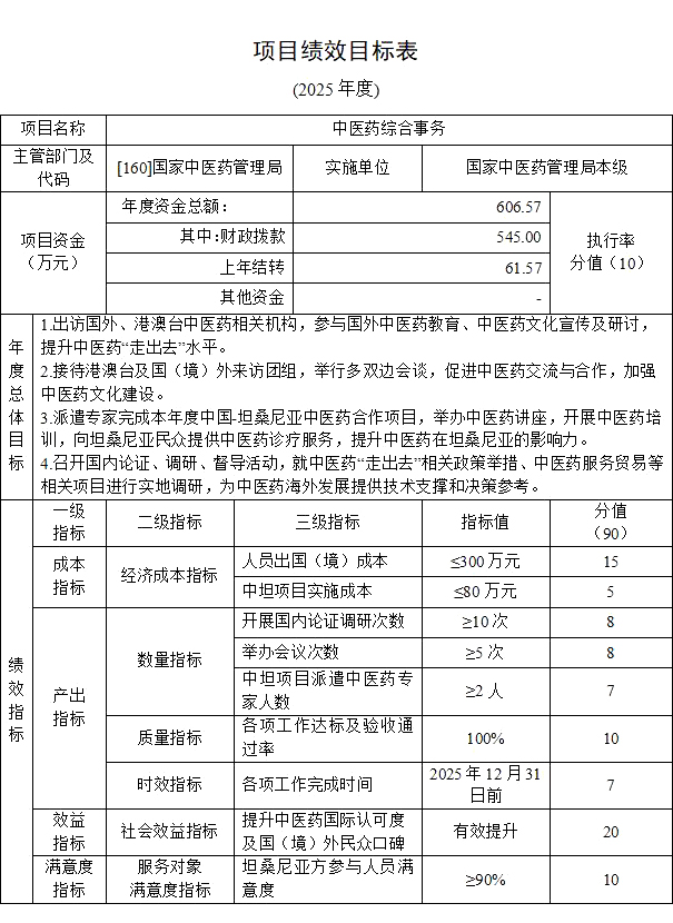 2025年對國家中醫藥管理局項目支出全面實施績效目標管理,涉及預算撥款164,023.42萬元,其中,涉及一般公共預算撥款161,623.42萬元、國有資本經營預算撥款2,400萬元。根據以前年度績效評價結果,優化中央所屬(管)醫院服務能力建設等項目支出2025年預算安排,并進一步改進管理、完善政策。