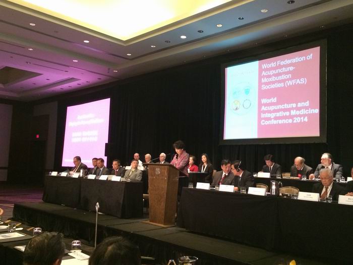 2014年11月1日,由世界針灸學(xué)會(huì)聯(lián)合會(huì)、中國(guó)中醫(yī)科學(xué)院共同主辦,由美國(guó)華美中醫(yī)學(xué)院承辦,美國(guó)休斯敦市政府、中國(guó)中藥協(xié)會(huì)和中國(guó)保健協(xié)會(huì)協(xié)辦的世界針灸學(xué)會(huì)聯(lián)合會(huì)針灸與結(jié)合醫(yī)學(xué)大會(huì)在美國(guó)休斯敦順利召開(kāi),共有來(lái)自40多個(gè)國(guó)家和地區(qū)的800多名代表參加。本屆大會(huì)聯(lián)合主席中國(guó)中醫(yī)科學(xué)院院長(zhǎng)張伯禮院士、世界針灸學(xué)會(huì)聯(lián)合會(huì)主席劉保延教授、中國(guó)國(guó)家中醫(yī)藥管理局國(guó)際合作司王笑頻司長(zhǎng)、美國(guó)休斯頓市市長(zhǎng)帕克·阿尼斯(Annise Paker)出席了大會(huì)開(kāi)幕式并致辭,原中國(guó)國(guó)家中醫(yī)藥管理局副局長(zhǎng)、中國(guó)中藥學(xué)會(huì)會(huì)長(zhǎng)房書(shū)亭教授到會(huì)祝賀。世界衛(wèi)生組織衛(wèi)生系統(tǒng)管理與服務(wù)運(yùn)行司傳統(tǒng)醫(yī)學(xué)處張奇主任和美國(guó)國(guó)會(huì)議員、德克薩斯州州長(zhǎng)瑞奇·佩利(Rick Perry)發(fā)來(lái)賀信,休斯敦市旅游局局長(zhǎng)佐治·弗蘭茲( Franz Jorge)代表前任市長(zhǎng)功薩雷斯向大會(huì)道賀。還有多名美國(guó)政要發(fā)來(lái)親筆簽名賀信,對(duì)本次會(huì)議的成功召開(kāi)表示了熱烈祝賀。