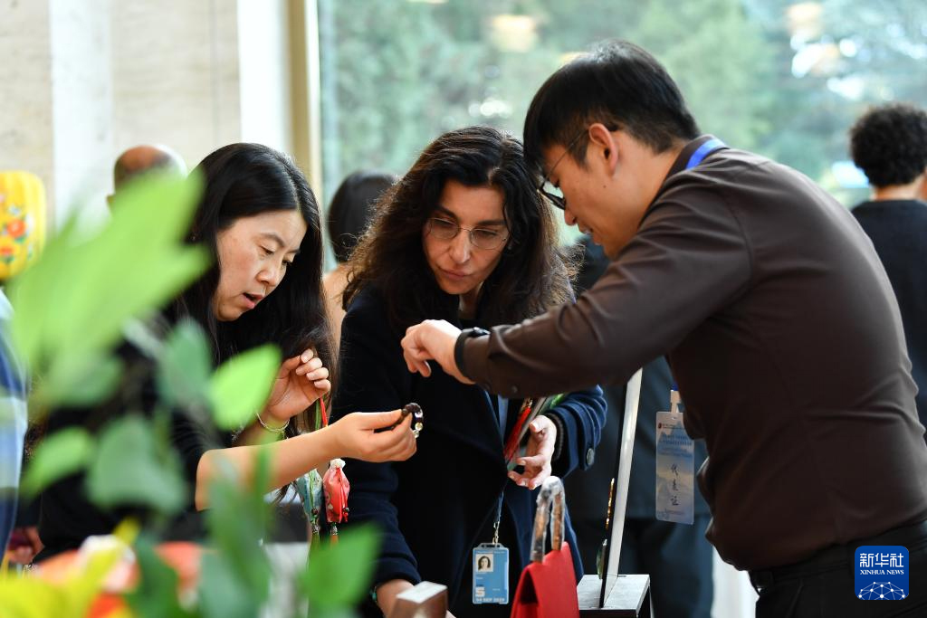10月29日,在瑞士日內(nèi)瓦萬(wàn)國(guó)宮,嘉賓在“中醫(yī)聯(lián)世界 參香滿重陽(yáng)——中醫(yī)藥走進(jìn)萬(wàn)國(guó)宮”文化活動(dòng)上了解人參香味的手串。新華社記者 連漪 攝