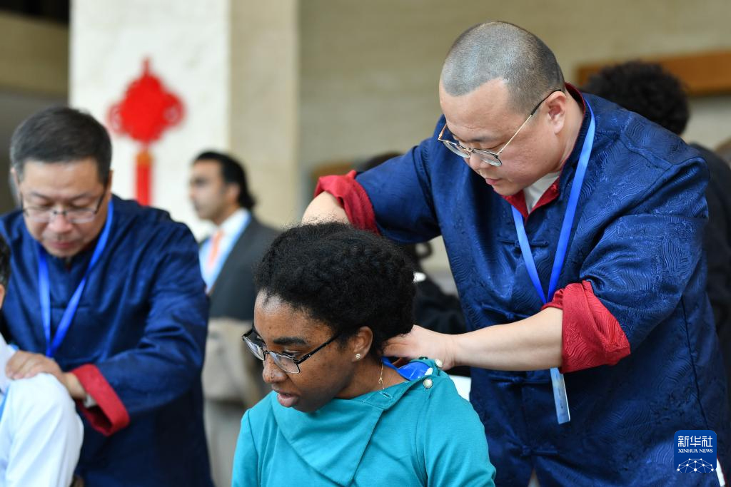 10月29日,在瑞士日內(nèi)瓦萬(wàn)國(guó)宮,嘉賓在“中醫(yī)聯(lián)世界 參香滿重陽(yáng)——中醫(yī)藥走進(jìn)萬(wàn)國(guó)宮”文化活動(dòng)上體驗(yàn)中醫(yī)按摩。新華社記者 連漪 攝