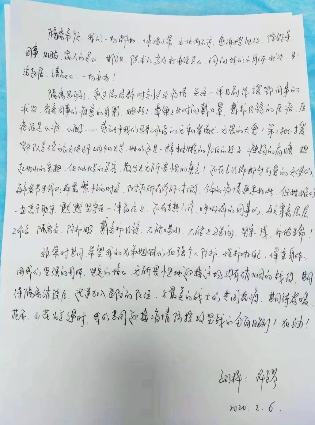 陳智華在隔離病房開啟了遠程辦公。臨床一線的醫生有什么問題,他都在微信或是電話這頭耐心解答,與前線的同事們一起抗擊疫情。許員琴隔離期間不忘囑咐科里的護士安排好工作,注意自身防護。其他醫務人員也從不放松新冠肺炎相關知識的學習,時刻為出來后奮戰一線做好充足準備!他們還給前線的醫生寫信加油鼓勁,解除隔離后,還要與大家并肩作戰,共同抗疫!