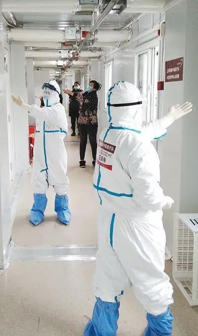 武漢雷神山醫院,上海支援湖北醫療隊的醫護人員在教患者按照“六字訣”中醫功法進行鍛煉。