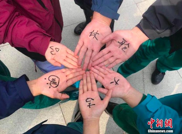 醫(yī)護(hù)人員在手心里寫(xiě)著“休艙大吉”。