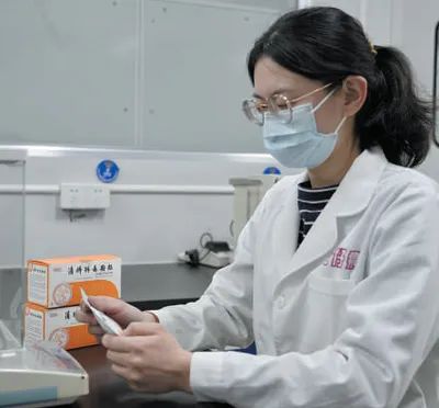 漳州片仔癀藥業股份有限公司工作人員對清肺排毒顆粒進行檢驗。林逸培攝