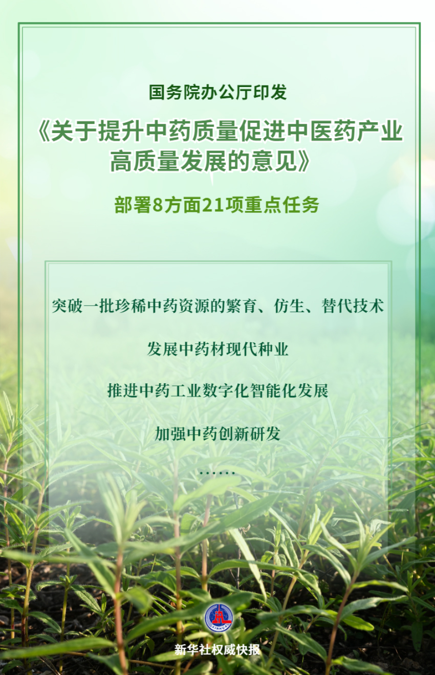 國(guó)務(wù)院辦公廳印發(fā)的《關(guān)于提升中藥質(zhì)量促進(jìn)中醫(yī)藥產(chǎn)業(yè)高質(zhì)量發(fā)展的意見》3月20日對(duì)外發(fā)布。