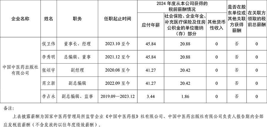 2024年國家中醫藥管理局所監管企業負責人薪酬信息披露