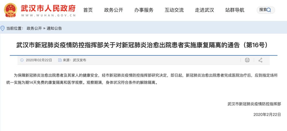 為保障新冠肺炎治愈出院患者及其家人的健康安全,經市新冠肺炎疫情防控指揮部研究決定,即日起,新冠肺炎治愈出院患者完成醫(yī)院治療后,應到指定場所統(tǒng)一實施為期14天免費的康復隔離和醫(yī)學觀察。觀察期滿,身體狀況符合條件的解除隔離。