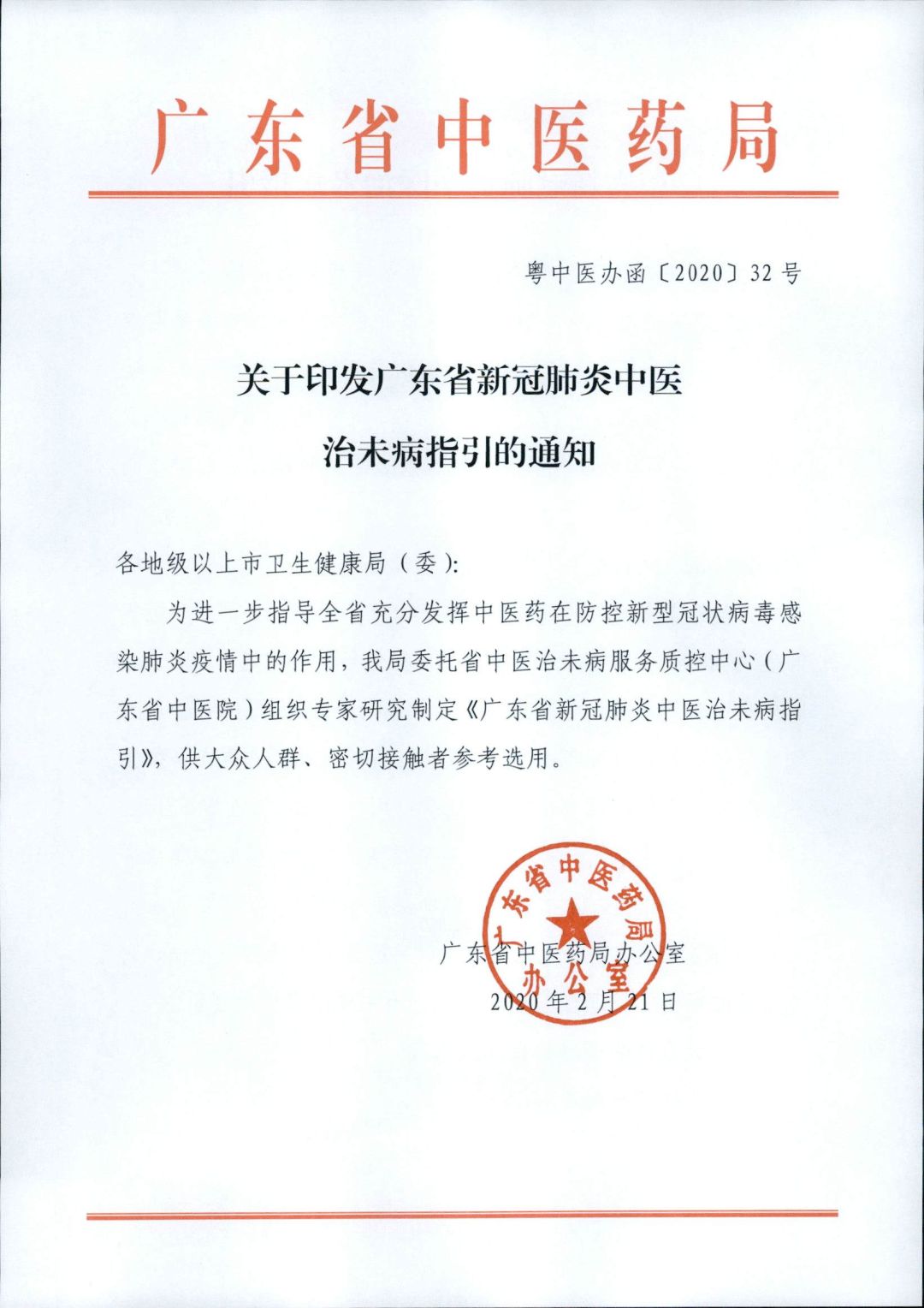 為進一步指導廣東省充分發(fā)揮中醫(yī)藥在防控新冠肺炎疫情中的作用,廣東省中醫(yī)藥局委托廣東省中醫(yī)治未病服務控制中心(廣東省中醫(yī)院)組織專家研究制定《廣東省新冠肺炎中醫(yī)治未病指引》,供大眾人群、密切接觸者參考選用。