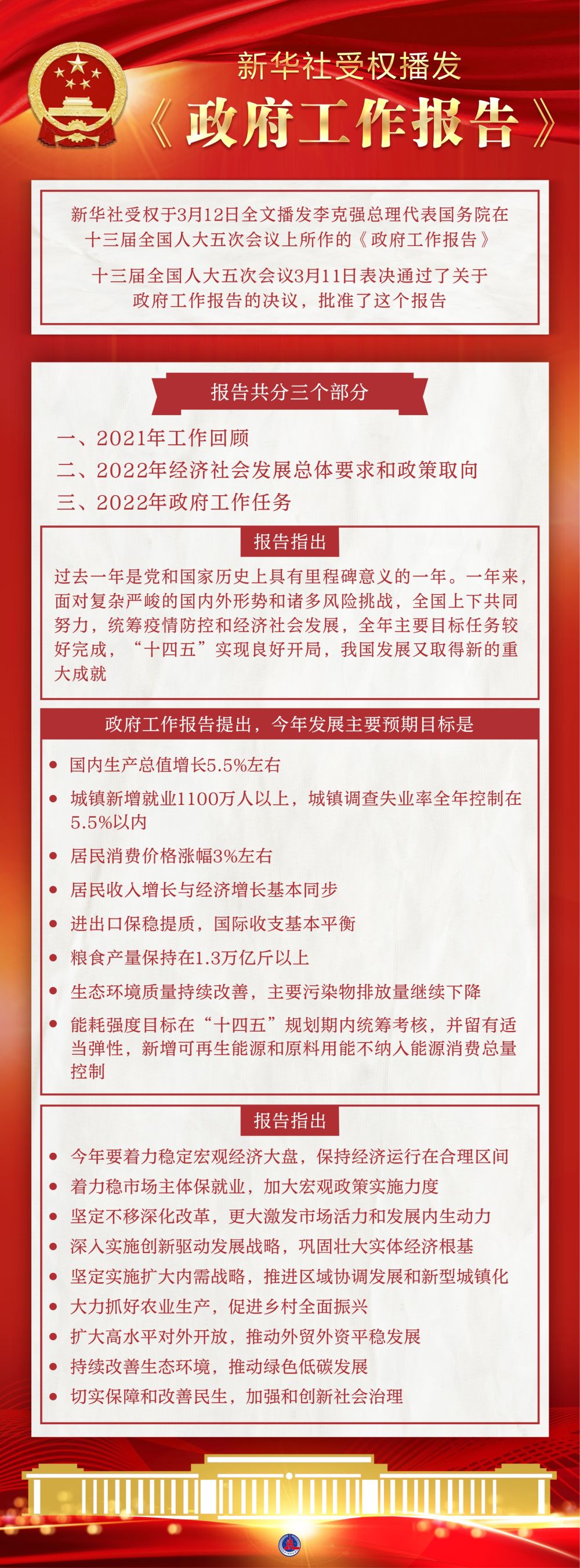 報告共分三個部分:一、2021年工作回顧;二、2022年經(jīng)濟(jì)社會發(fā)展總體要求和政策取向;三、2022年政府工作任務(wù)。