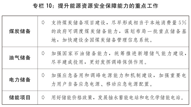 二是提升能源資源安全保障能力。深入推進煤電油氣產供儲銷體系建設。推進石油儲備重大工程建設,加快華北、西北等地下儲氣庫新建和擴容達容建設。有序核增一批煤炭先進產能,加快提升煤炭儲備能力。加強抽水蓄能等調峰電源建設,繼續發揮傳統能源特別是煤炭、煤電的兜底保供和調峰作用,積極推進現有煤電項目改造升級。推進白鶴灘、羊曲等重大水電工程建設。加大力度規劃建設以大型風光電基地為基礎、以其周邊清潔高效先進節能的煤電為支撐、以穩定安全可靠的特高壓輸變電線路為載體的新能源供給消納體系。加快推進國家儲備建設,健全統一的戰略和應急物資儲備體系。