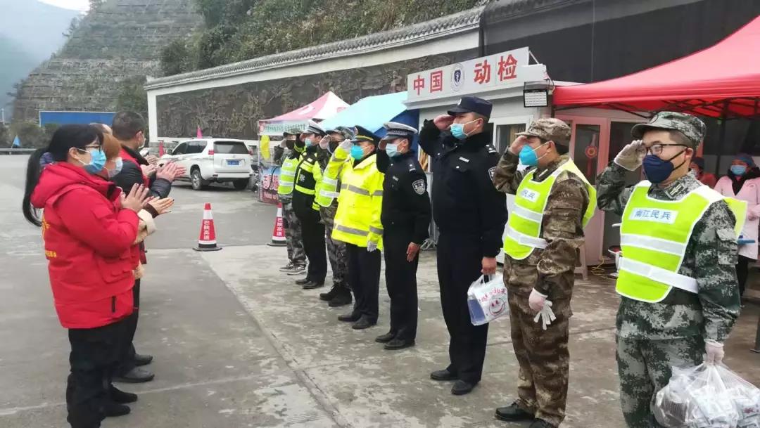 南江縣中醫醫院志愿者向巴陜高速南江南、南江北留驗站,給防控一線干警、民兵送去預防中藥。圖為一線工作人員向志愿者敬禮致謝