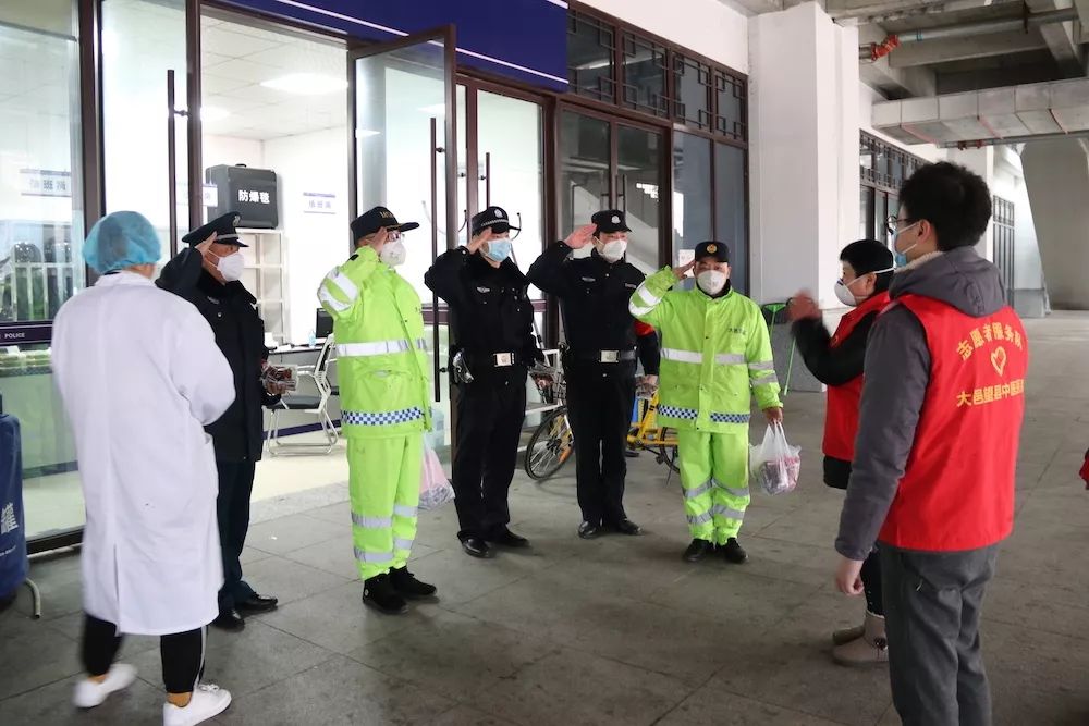 收到中藥預防湯劑的一線執勤人員向大邑望縣中醫醫院志愿者敬禮