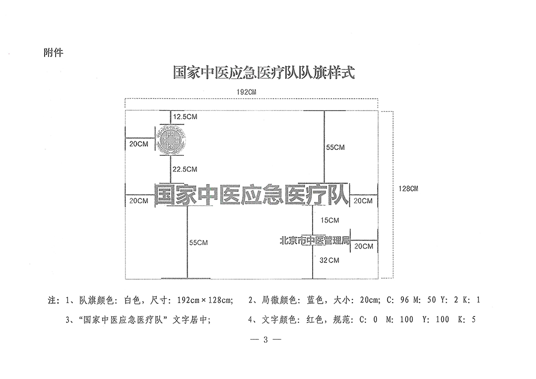 三、醫(yī)療隊要按照國家中醫(yī)藥管理局統(tǒng)一要求制作隊旗,隊旗第一行為國家中醫(yī)藥管理局局徽圖案,第二行為“國家中醫(yī)應(yīng)急醫(yī)療隊”字樣,第三行為醫(yī)療隊所在省(區(qū)、市)中醫(yī)藥管理局或國家中醫(yī)藥管理局直屬(管)單位名稱;隊旗為白色,局徽為藍(lán)色,文字為紅色。具體樣式見附件。