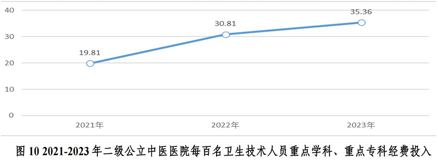 二是人才培養和重點學科、重點??平ㄔO經費投入逐年增長。2023年,二級公立中醫醫院人才培養經費投入總金額為5.6億,較2022年增加26.08%,人才培養經費投入占比為0.31%,較2022年增長0.06個百分點;每百名衛生技術人員重點學科、重點專科經費投入為35.36萬元,較2022年增加4.55萬元(見圖10)。二級公立中醫醫院不斷增加人才培養及重點學科、重點??平涃M投入,為推進中醫藥人才隊伍建設和中醫優勢??平ㄔO創造條件。