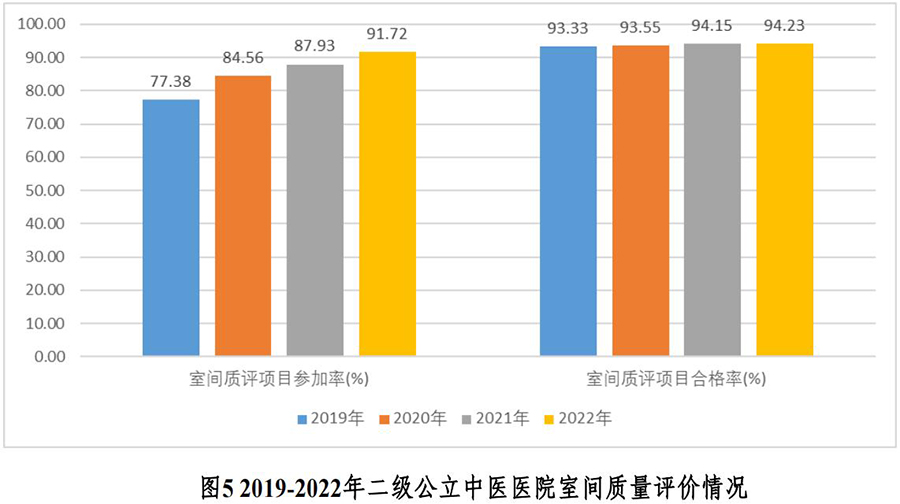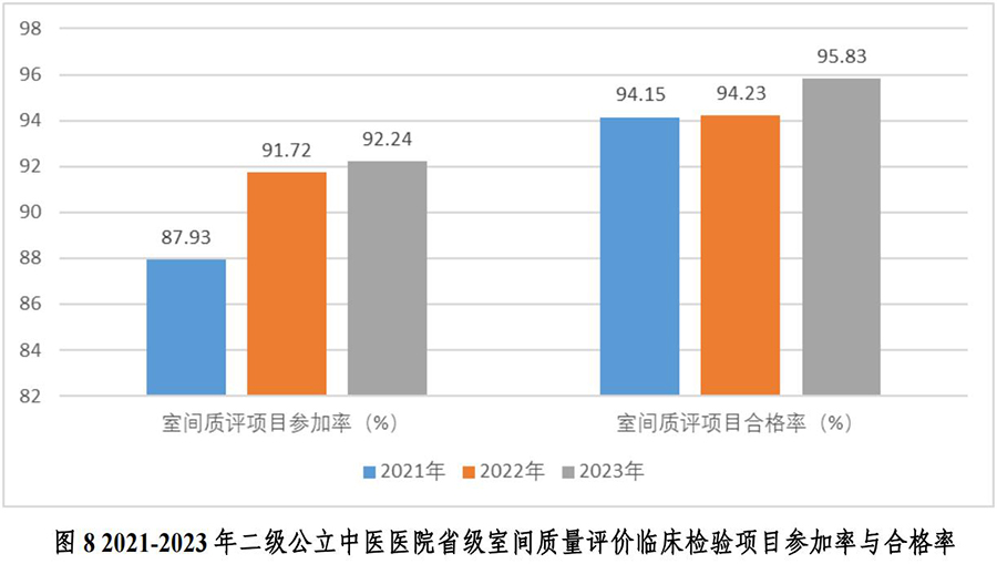 三是臨床檢查檢驗可比性持續提升。2023年,全國二級公立中醫醫院省級室間質量評價臨床檢驗項目參加率與合格率分別為92.24%和95.83%,較2022年分別提升0.52個和1.60個百分點(見圖8)。
