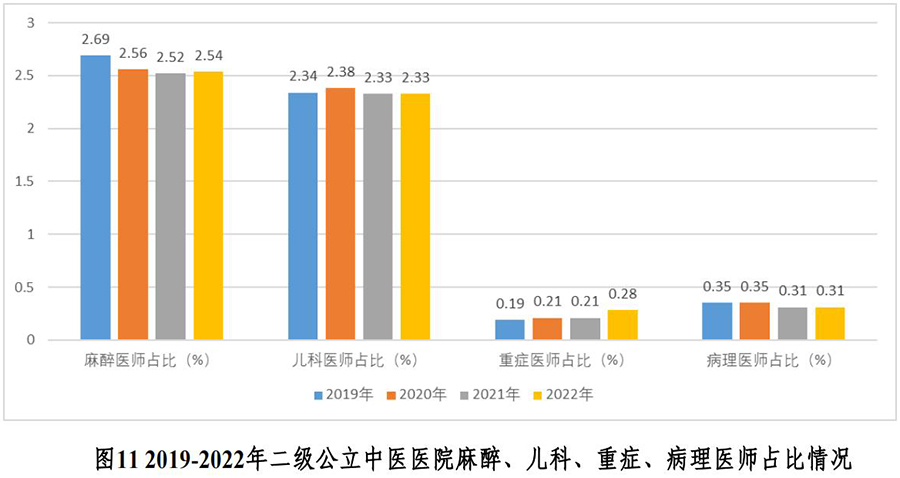 在人員結構方面。中醫類別執業醫師(含執業助理醫師)占執業醫師總數比例為49.30%,比2021年提升1.13個百分點。二級公立中醫醫院積極貫徹落實“中醫醫療機構配備醫務人員應當以中醫藥專業技術人員為主,主要提供中醫藥服務”的規定和要求,逐步提升中醫類別執業醫師(含執業助理醫師)的占比(見圖10)。麻醉、重癥、感染性疾病科醫師數量較2021年均有不同程度增長,其中重癥醫師數量增長最多,且幅度增長最高(見圖11)。北京、河南、湖北等省份的相關專業緊缺醫師占比增長較快。在學科建設方面。每百名衛生技術人員重點學科、重點??平涃M投入為30.81萬元,較2021年增長55.53%。二級公立中醫醫院持續加大重點學科、重點??平涃M投入,為培養高水平的中醫臨床人才和中醫藥創新人才創造了有利條件。