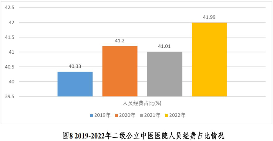 二是收支結構不斷優化。醫療服務價格動態調整并持續優化,醫務人員的技術勞務價值得到進一步體現。在醫療收入結構方面。2022年全國二級公立中醫醫院醫療服務收入占比為33.26%,較2021年提升0.02個百分點;除檢查檢驗收入占比有所提升外,衛生材料收入和藥品收入占醫療收入比例分別較2021年降低0.18個和0.75個百分點。其中,重點監控高值醫用耗材收入占比為31.75%,較2021年下降4.78個百分點,重點監控化學藥品和生物制品收入占比為1.35%,較2021年基本保持穩定(見圖7)。在人員經費支出方面。人員經費占比為41.99%,較2021年提升0.98個百分點,人員經費支出增幅達到5.04%(見圖8)。二級公立中醫醫院通過充分落實“兩個允許”要求,不斷完善維護公益性、調動積極性、保障可持續的運行機制。